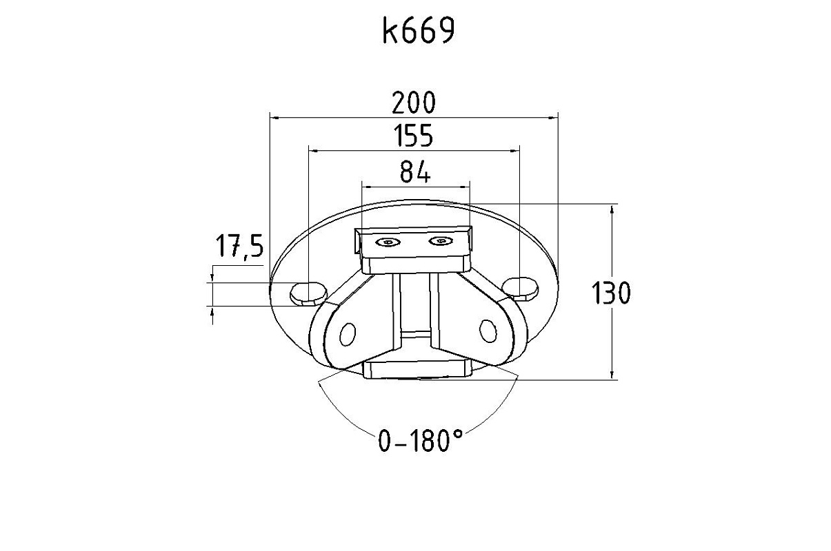 Крепление двух тяг к стене. Сварная, полированная деталь. Состоит из крепёжного элемента с двумя овальными технологическими отверстиями для крепления к стене и выносных частей с отверстиями диаметром 16,5 мм для крепежа наконечника тяги k661-L, k661-R