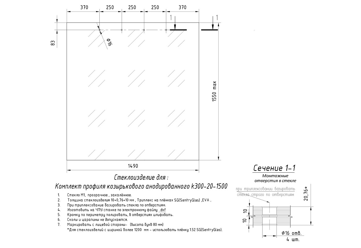 Требуются отверстия в стекле. Перед тем как сверлить отверстия в стекле, необходимо установить стекло в профиль, наметить отверстия, затем просверлить по отметкам. Стекло закаливается после сверления отверстий.