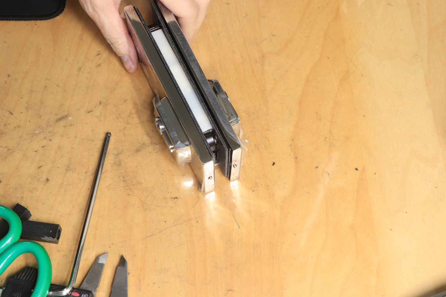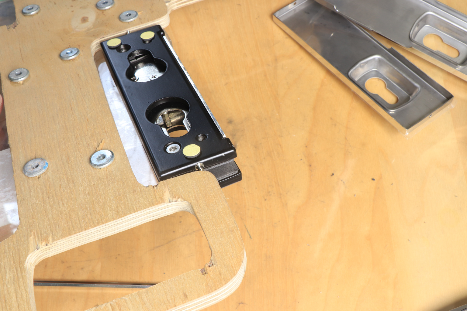 Сбоку нажимаем на крепления крышек и снимаем. Отвинчиваем винты, и фиксируем замок в подготовленный вырез в стекле. Далее закручиваем и фиксируем обратно крышки. Ответную часть крепим под замком с пробуренным отверстием под ригель.