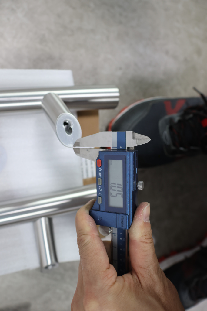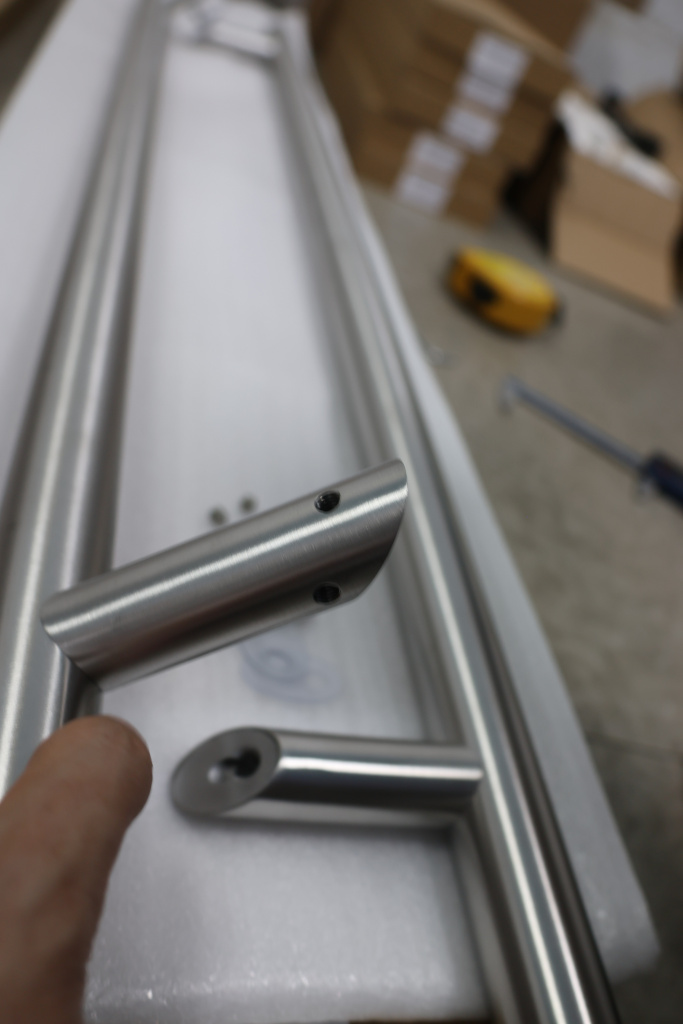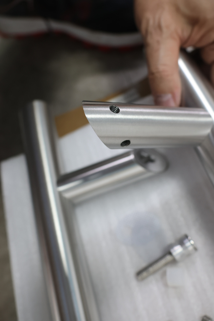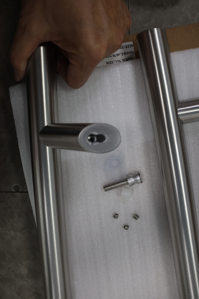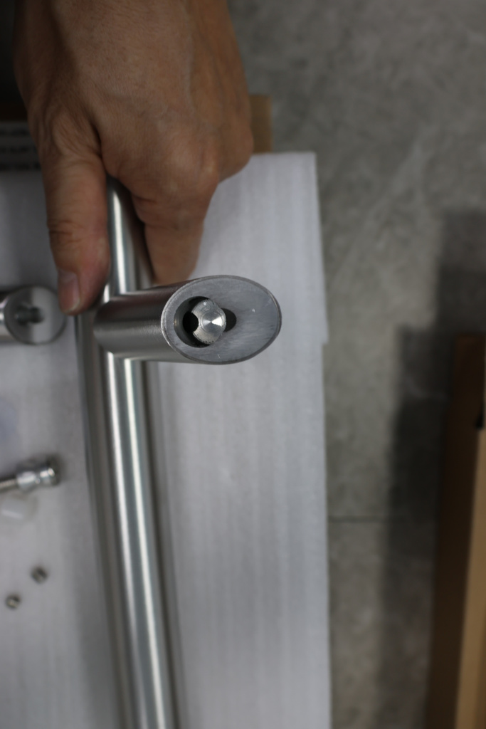 у основания ручки откручиваем с помощью шестигранника винты, делим ручку на две части, в заранее заготовленные отверстия вырезы в стекле 10-12 мм фиксируем первую часть ручки в отверстиях и с обратной стороны ответную часть затягиваем с помощью шестигранника