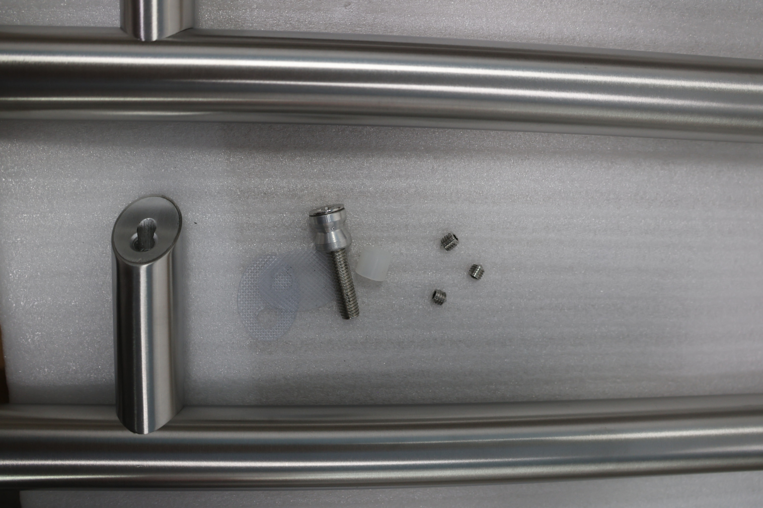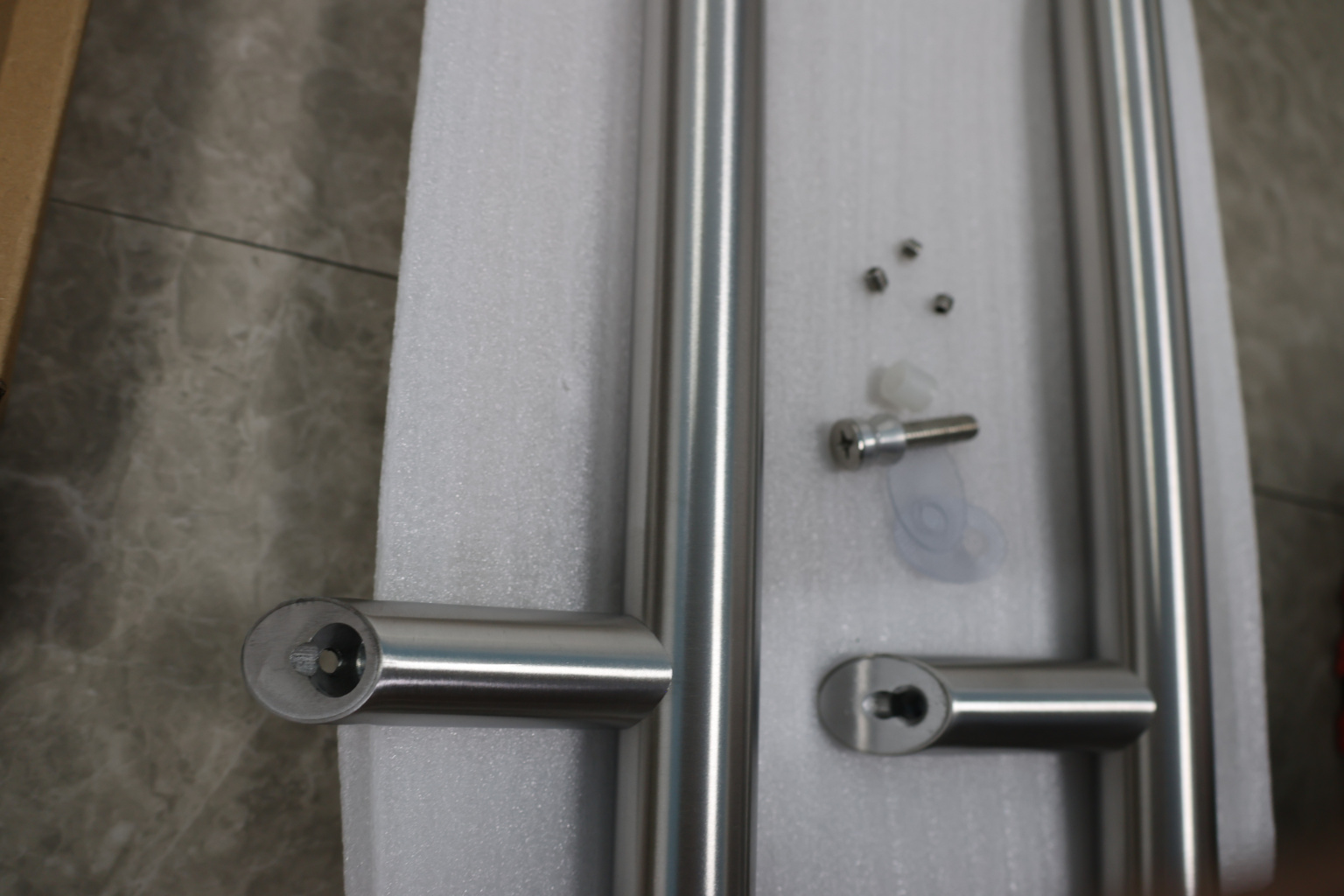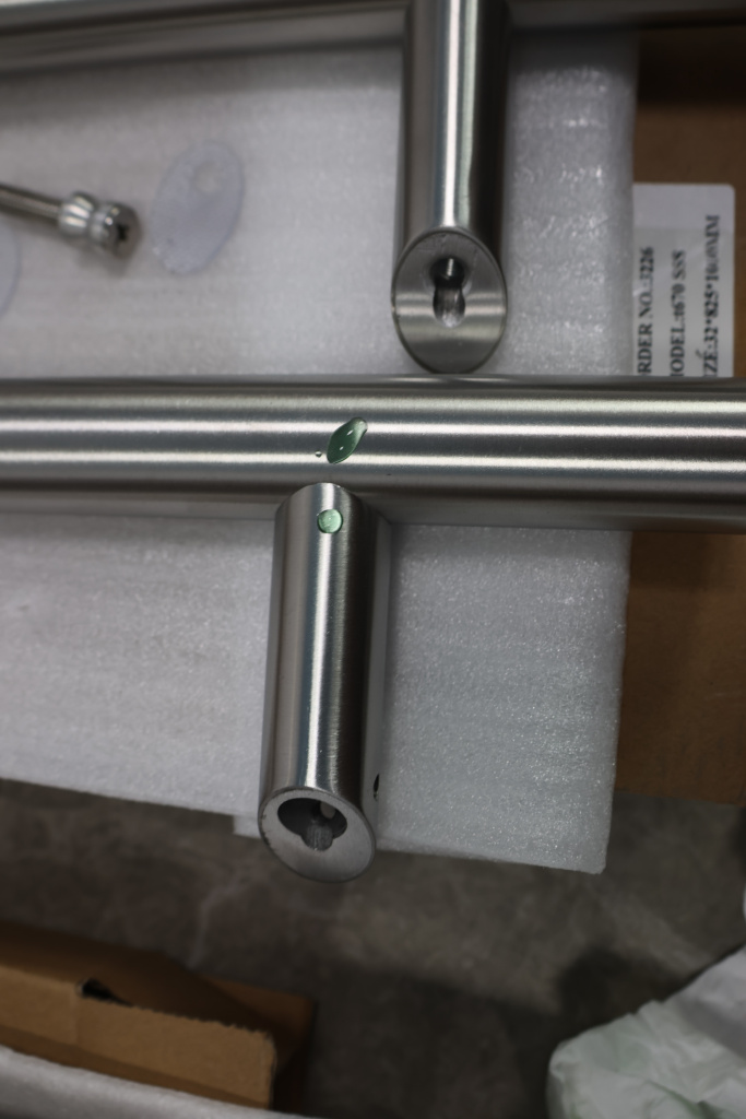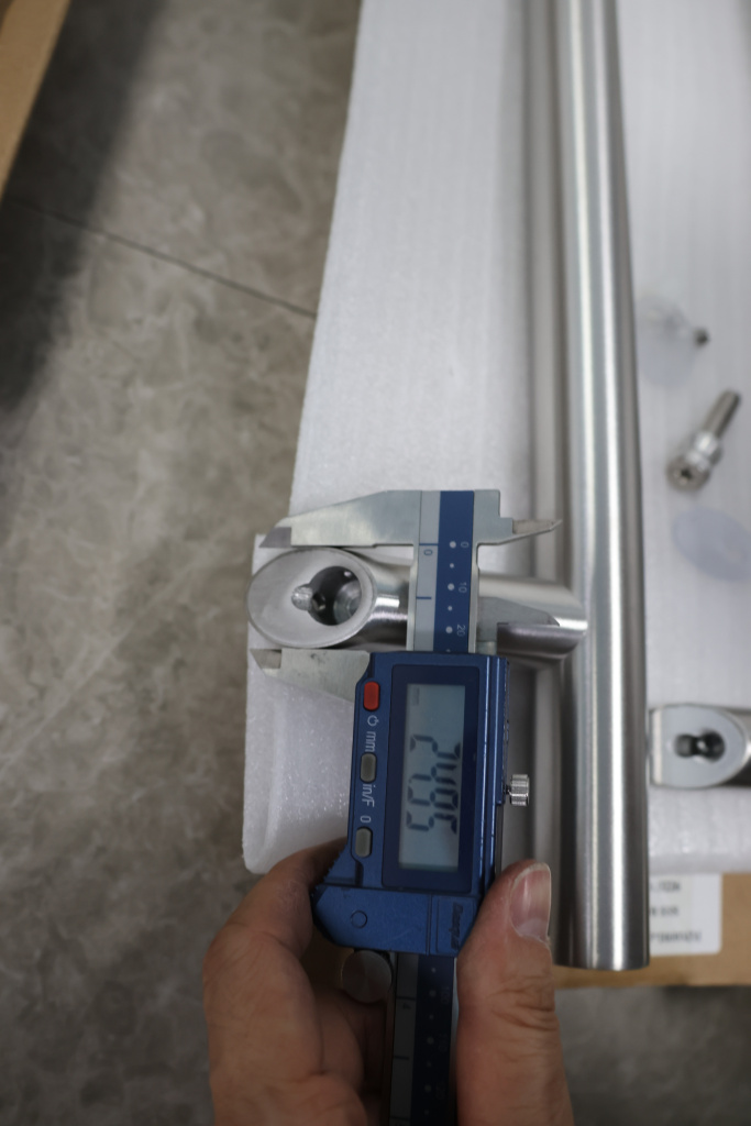 у основания ручки откручиваем с помощью шестигранника винты, делим ручку на две части, в заранее заготовленные отверстия вырезы в стекле 10-12 мм фиксируем первую часть ручки в отверстиях и с обратной стороны ответную часть затягиваем с помощью шестигранника