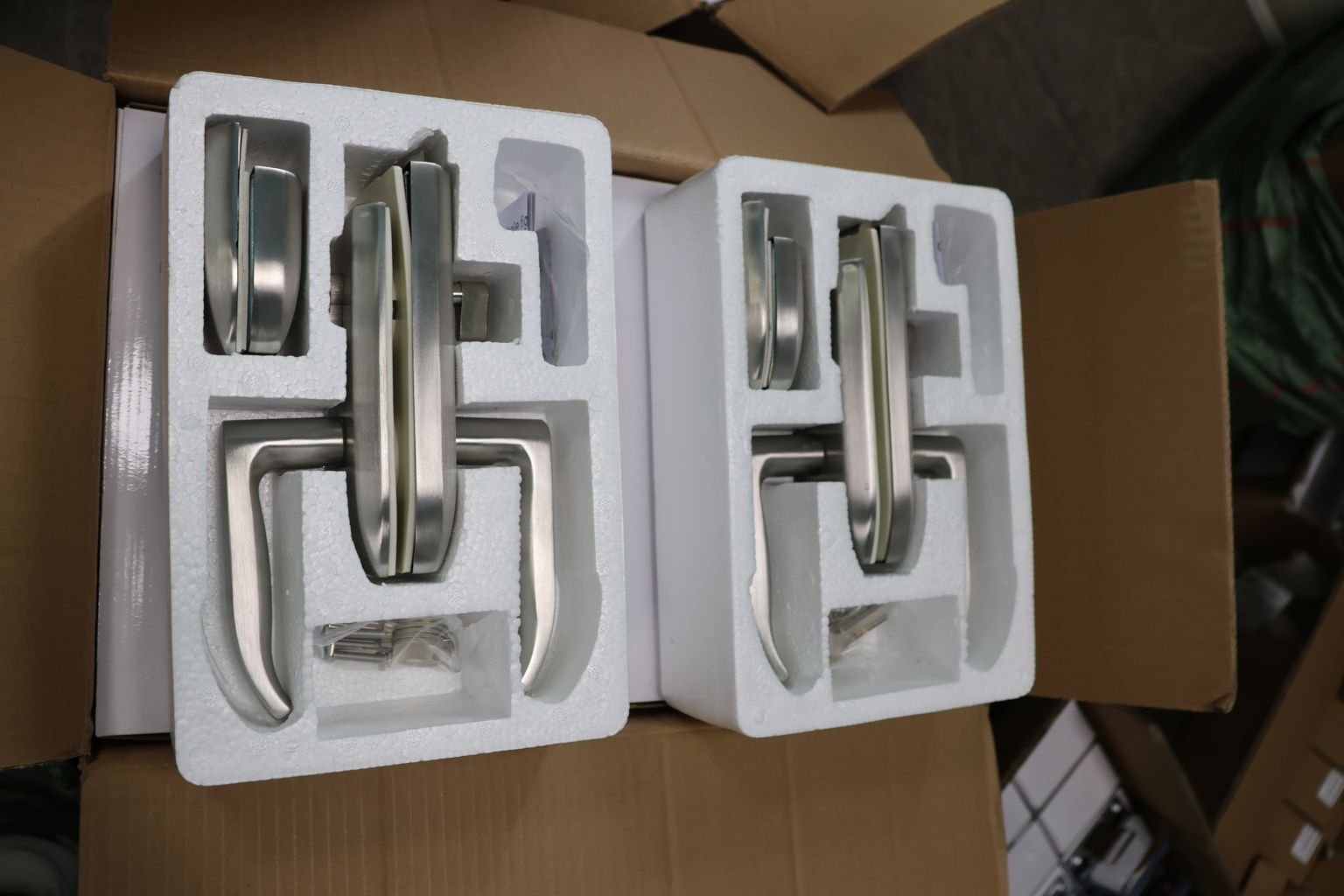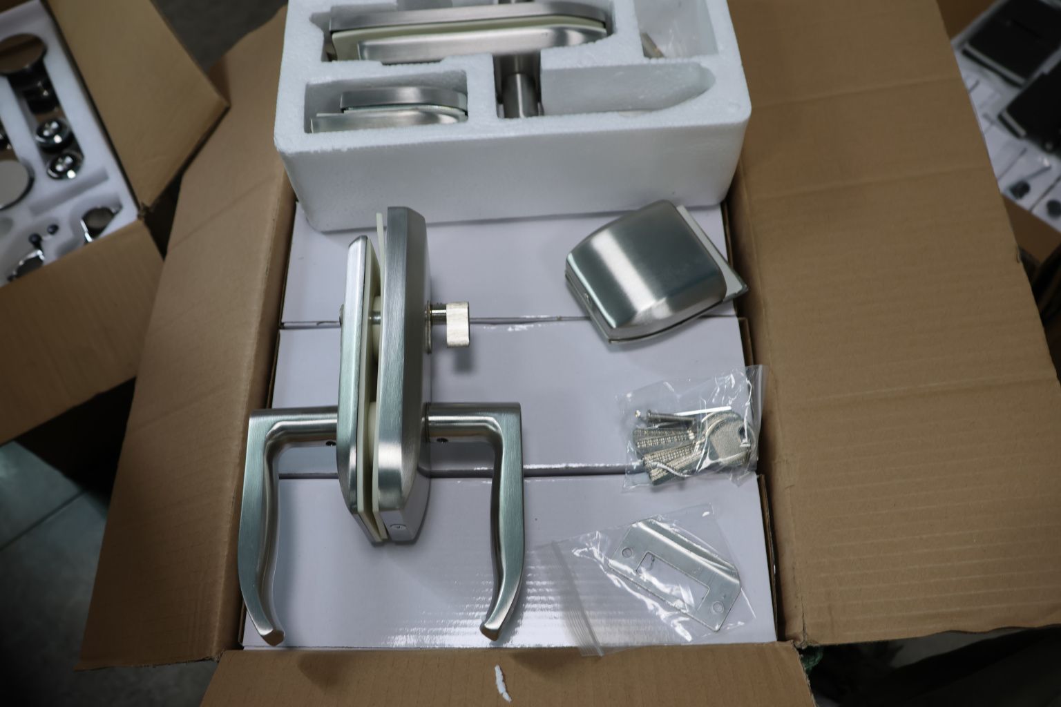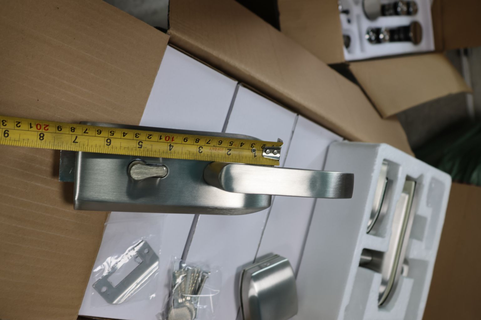 Замок с нажимной ручкой и притвором, евроцилиндр односторонний ключ/защелка, с ответной частью на стекло, шлифованный.