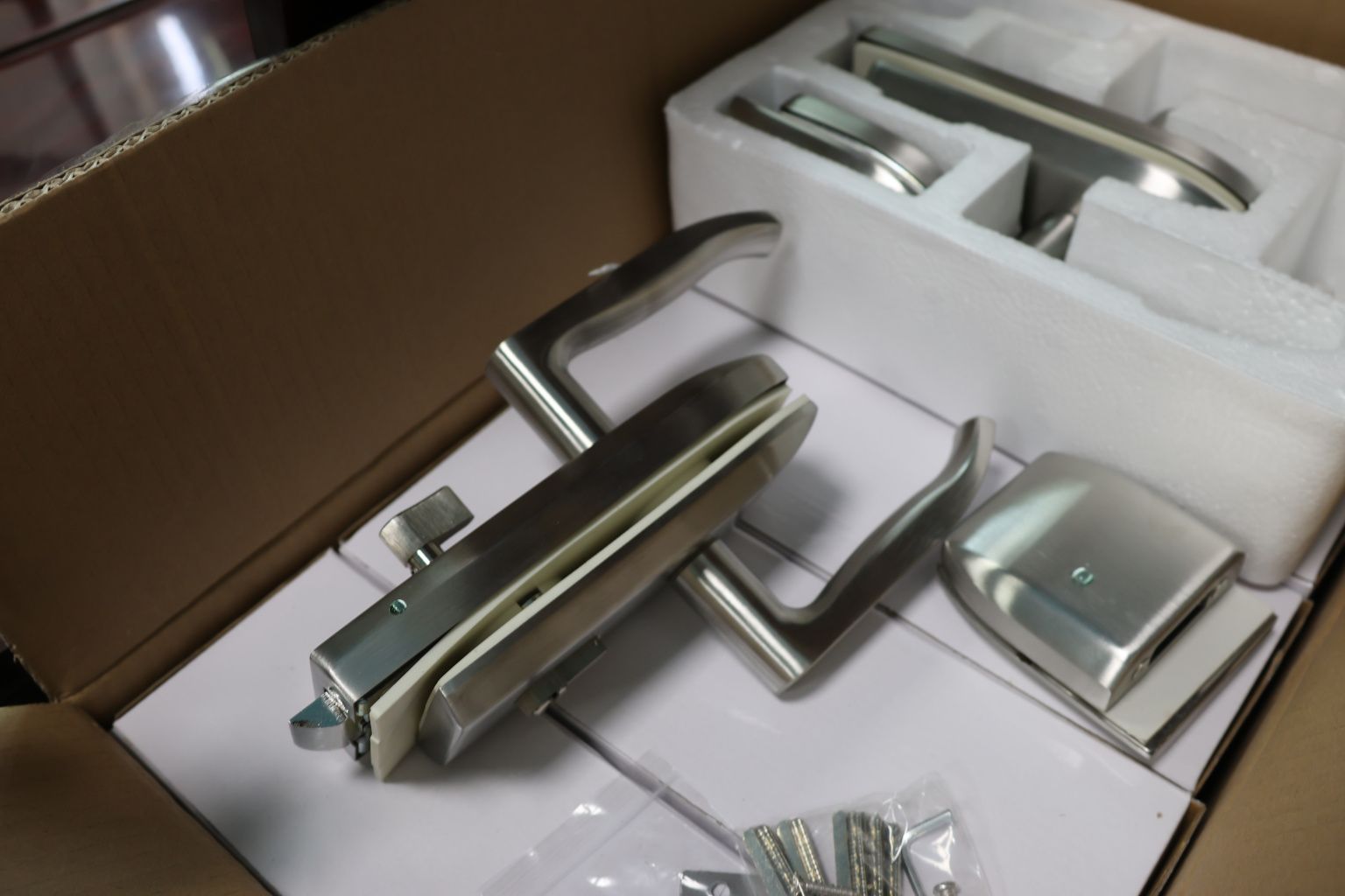 С помощью шестигранника открутить ручки замка, вертушку на личинке и два винта с торца замка. Открутить и снять крышки. Зафиксировать замок в подготовленный вырез в стекле. Далее закрутить и зафиксировать обратно замок. Крышки и ручки установить на место.