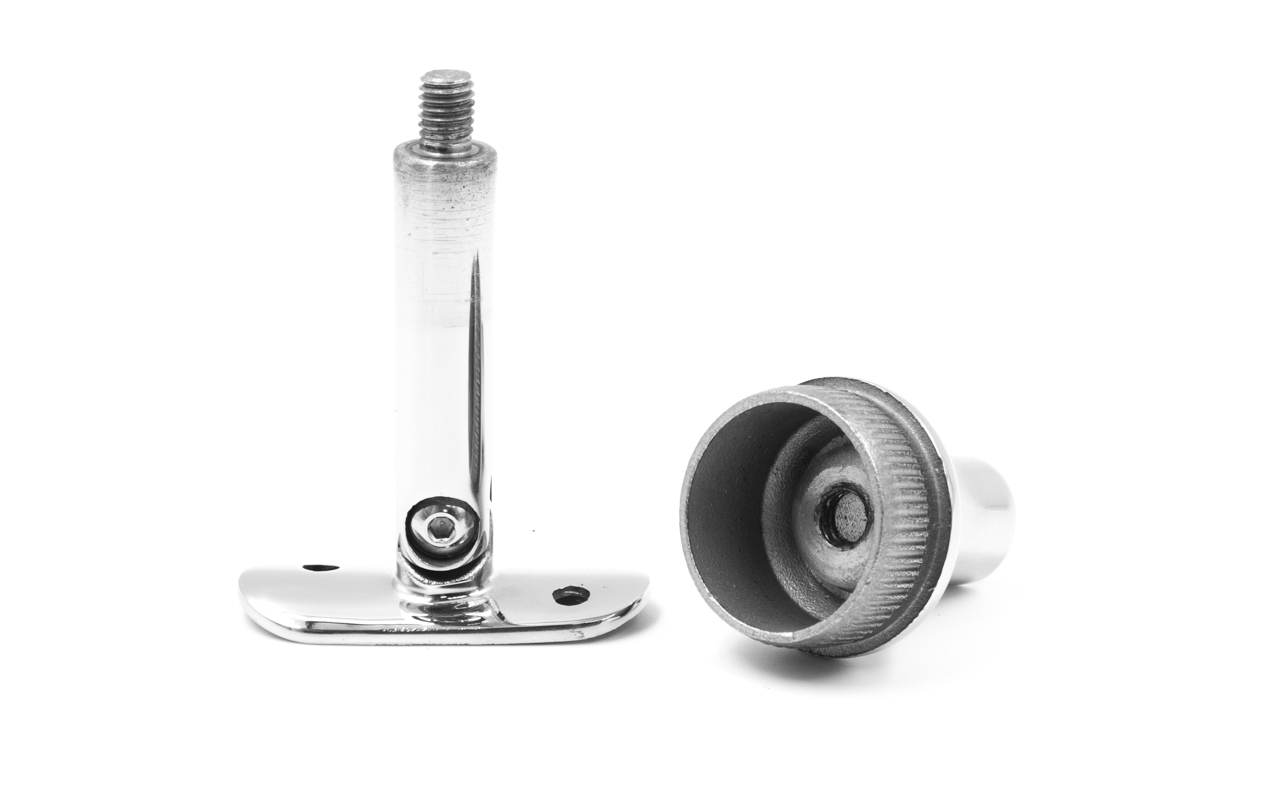 Наконечник регулируемый по высоте на стойку Ø38.1х1.5 мм, с регулируемым ложементом под поручень Ø50.8 мм. Деталь литая, полированная, нержавеющая. Марка детали - AISI 304