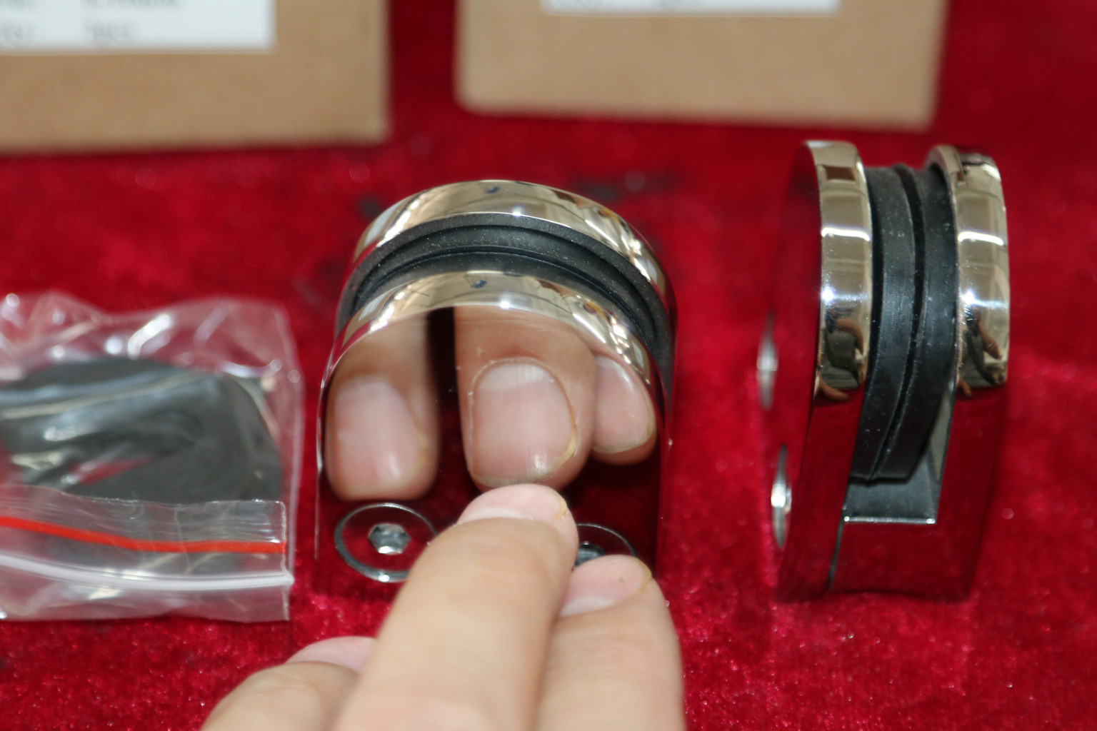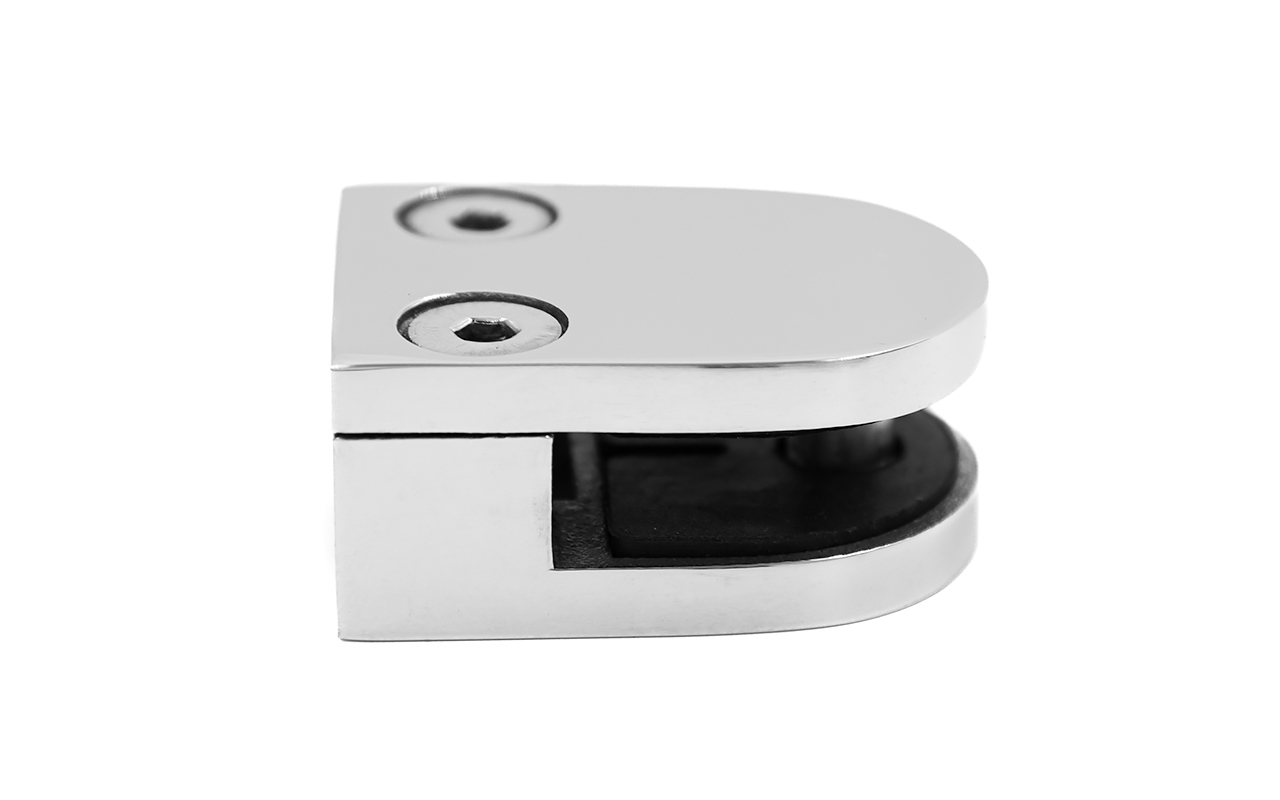 Стеклодержатель литой с вставками под стекло 8-10 мм, 4+4 мм, закругленный под стойку Ø38.1 мм (40х22х50), полированный. Марка стали - AISI 304.