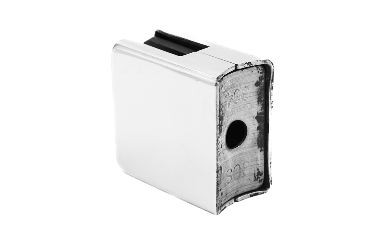 Стеклодержатель штампованный, под стекло 10 мм (5+5 мм), квадратный, под стойку Ø38.1 мм (40х24х48), полированный. Марка стали - AISI 304