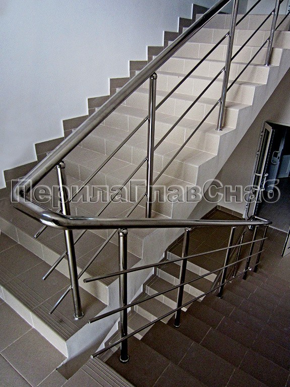 Ограждение лестницы из нержавеющей стали с дополнительным поручнем для инвалидов.Наконечники стоек в виде штырей, поручень для инвалидов крепится на выносных держателях.