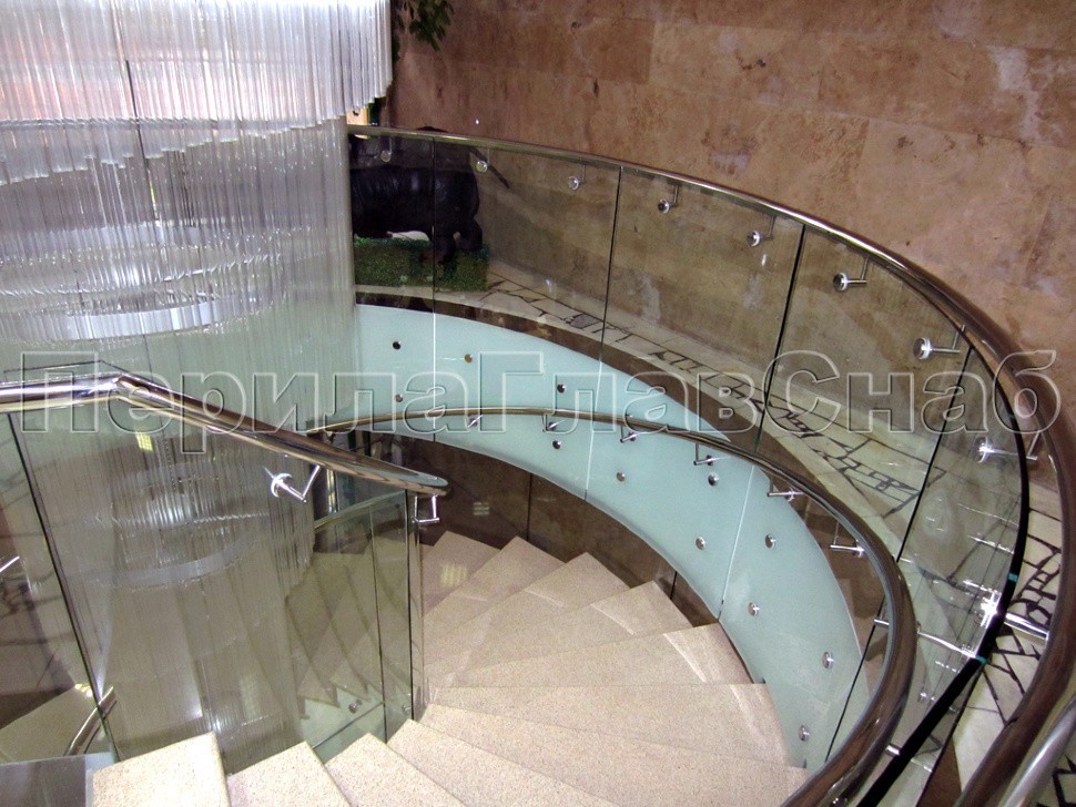 Крепление несущего моллированного (изогнутого) стекла было торцевым, относительно лестничного марша и атриума, а сверху, на выносах, к стеклу смонтирован полированный поручень из нержавеющей стали.