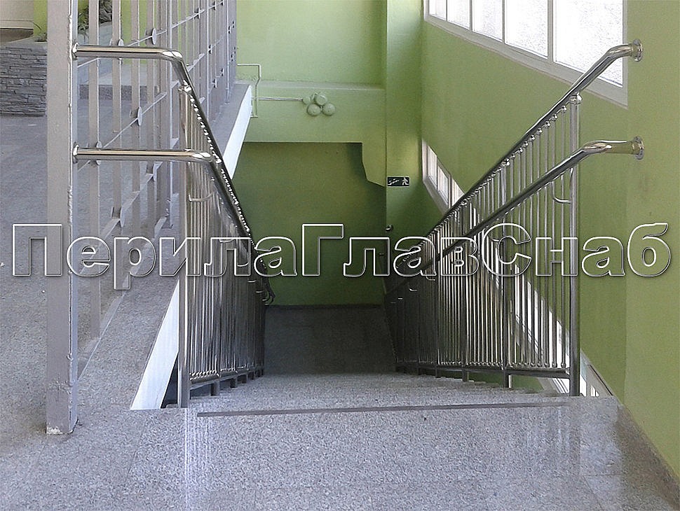 Перила для прямой лестница с креплением нержавеющего поручня к стойкам через полусферические наконечники.