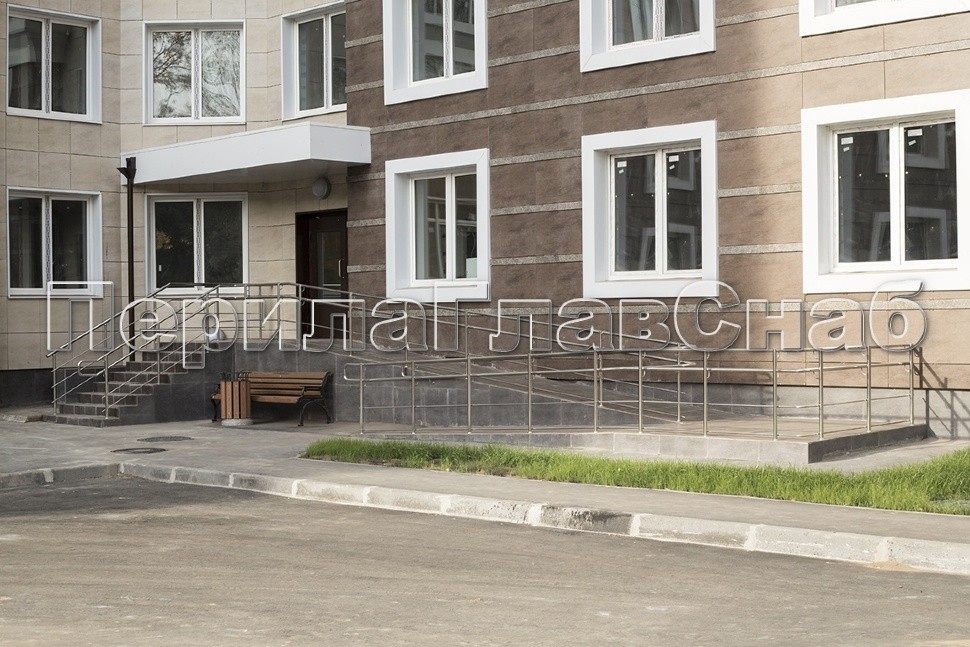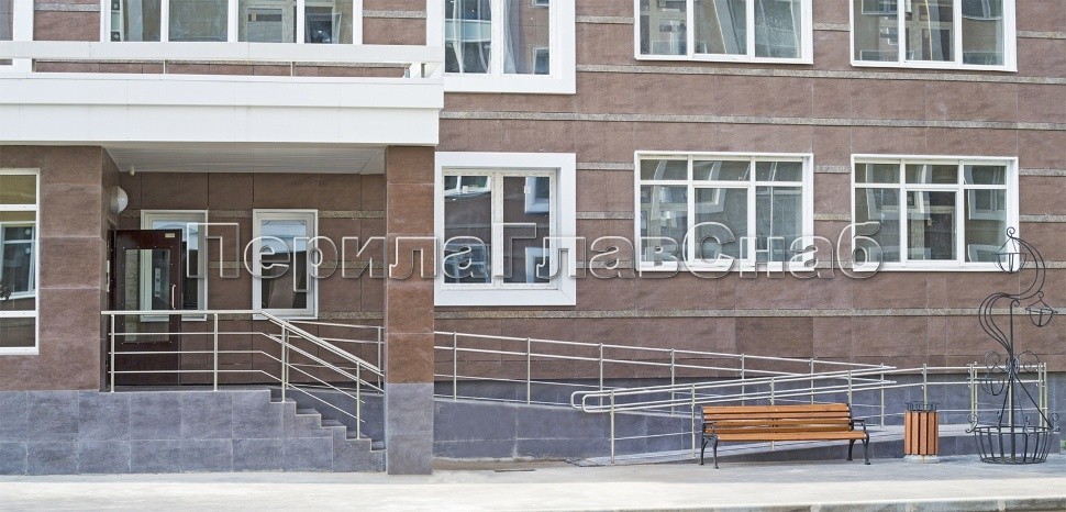 Ограждение входной группы выполнено из нержавеющей стали с трехригельным заполнением. Пандус для инвалидов с ограждением из нержавеющей стали.