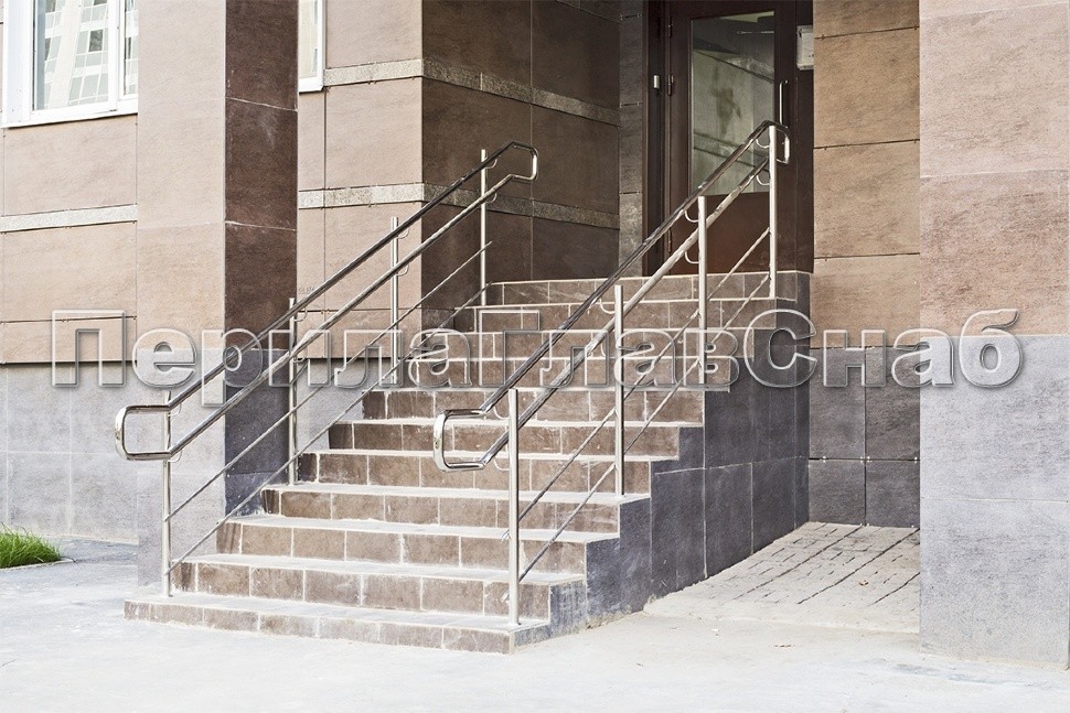 Ограждение входной группы выполнено из нержавеющей стали с трехригельным заполнением.