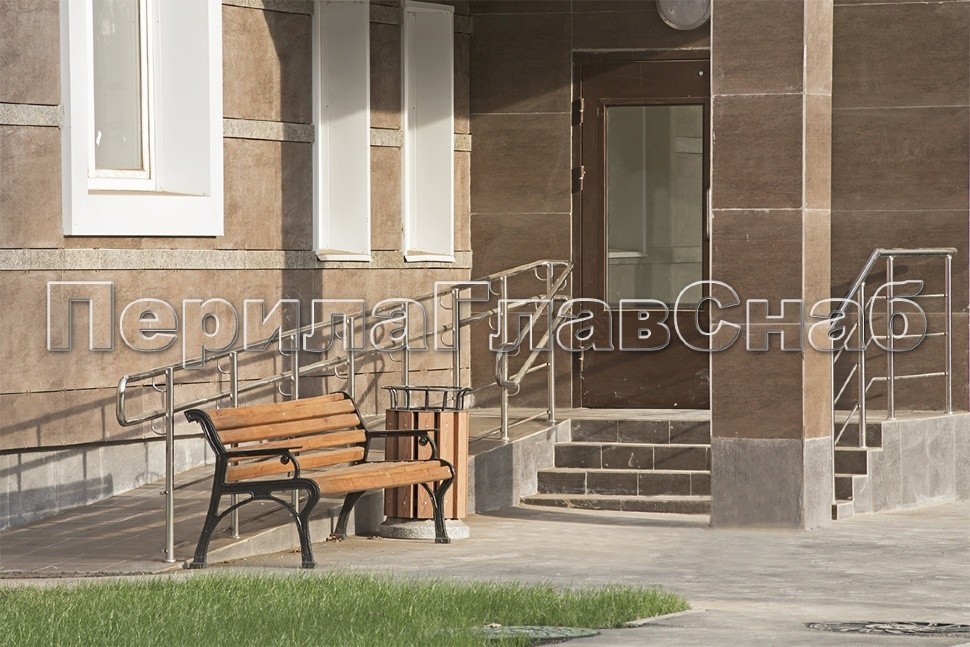 Пандус для инвалидов с ограждением из нержавеющей стали, стойки крепятся в пол.