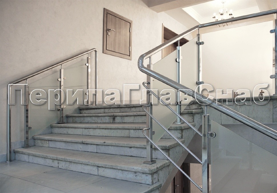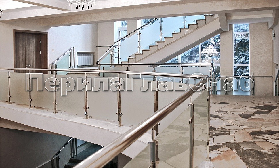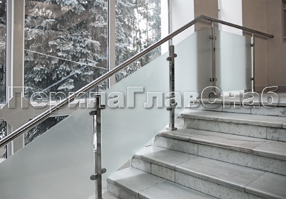 Ограждения лестницы на квадратных стойках 40х40 мм, крышка стойки k076. Стекло оклеено матовой пленкой. Стекло сложной формы на переходе на площадку.