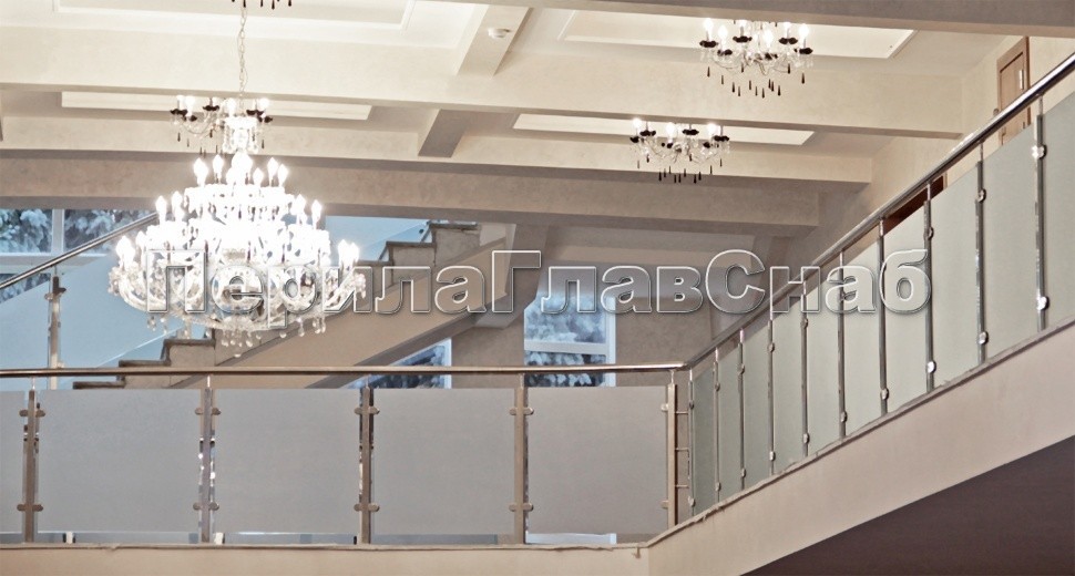 Ограждение лестницы со стеклом с матовой пленкой, поручень с уходом в пол.