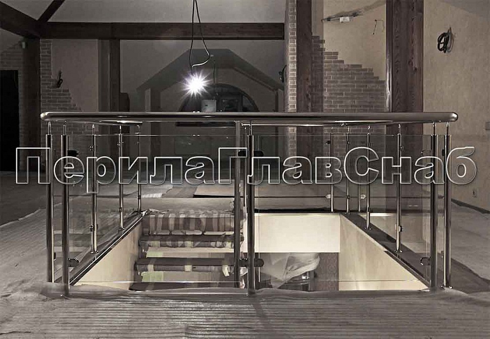 Стеклянные ограждения на круглых стойках с металлическим поручнем в частном доме.