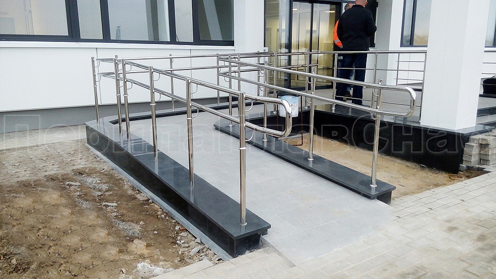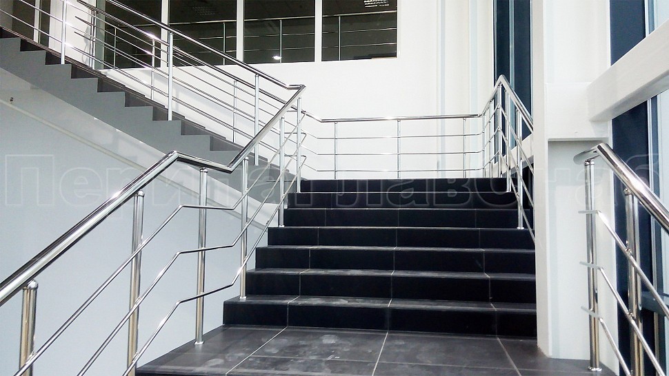 Административно-бытовому зданию были установлены ограждения с тремя ригелями для внутренней лестницы и входной группы из полированной нержавеющей стали. Высотой 950 мм и стойками диаметром 38 мм, с креплением сверху методом алмазного бурения диаметром 42 мм на глубину 70 мм, устанавливаются через две ступени в третью, низ стойки декоративная крышка диаметр 56 мм; поручень завязан, окончание поручня заглушка. Крепление нержавеющих элементов ограждения между собой точечная аргонно-дуговая сварка, с последующей зачисткой и полировкой.