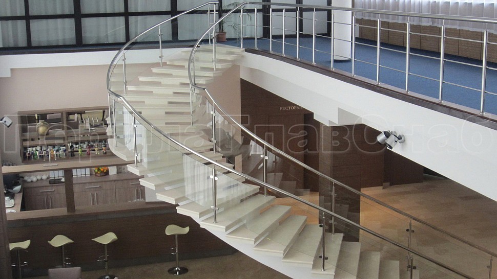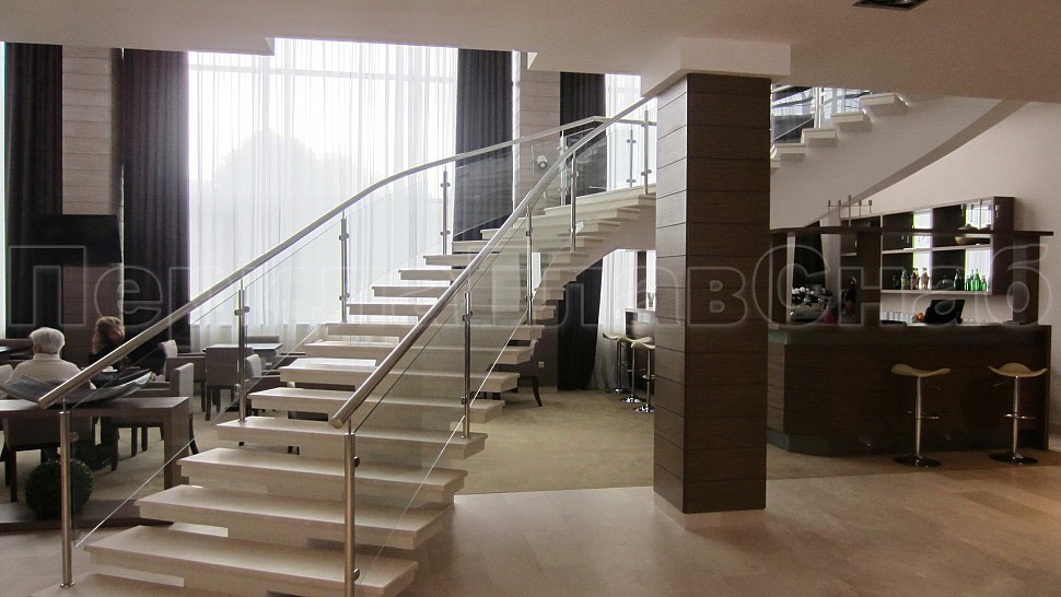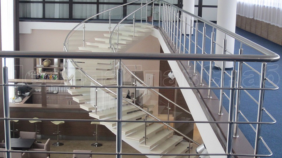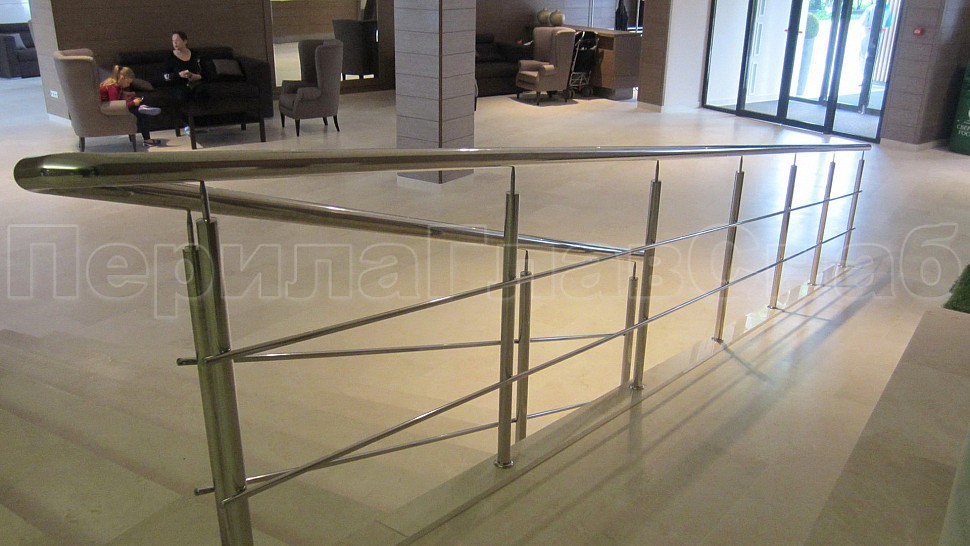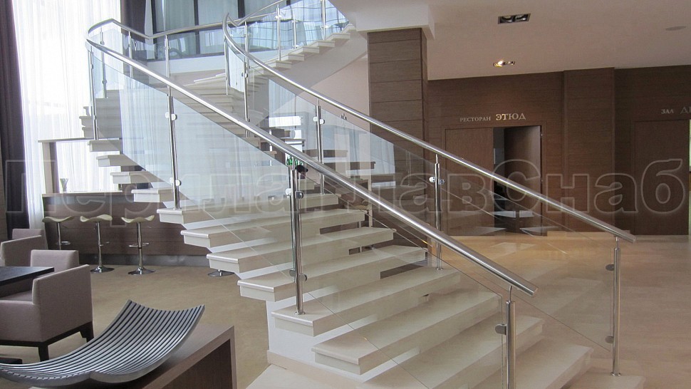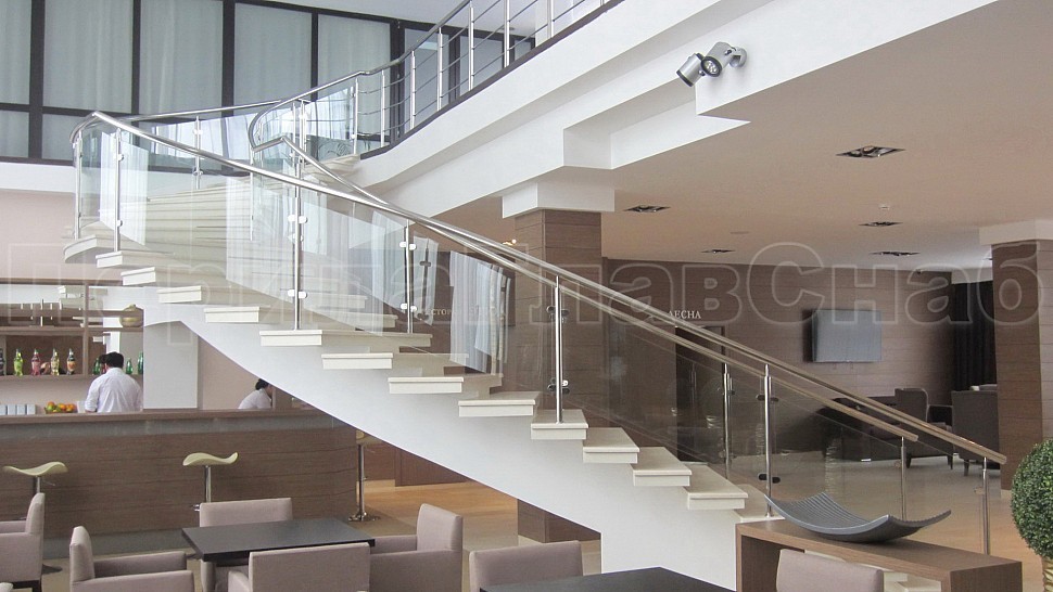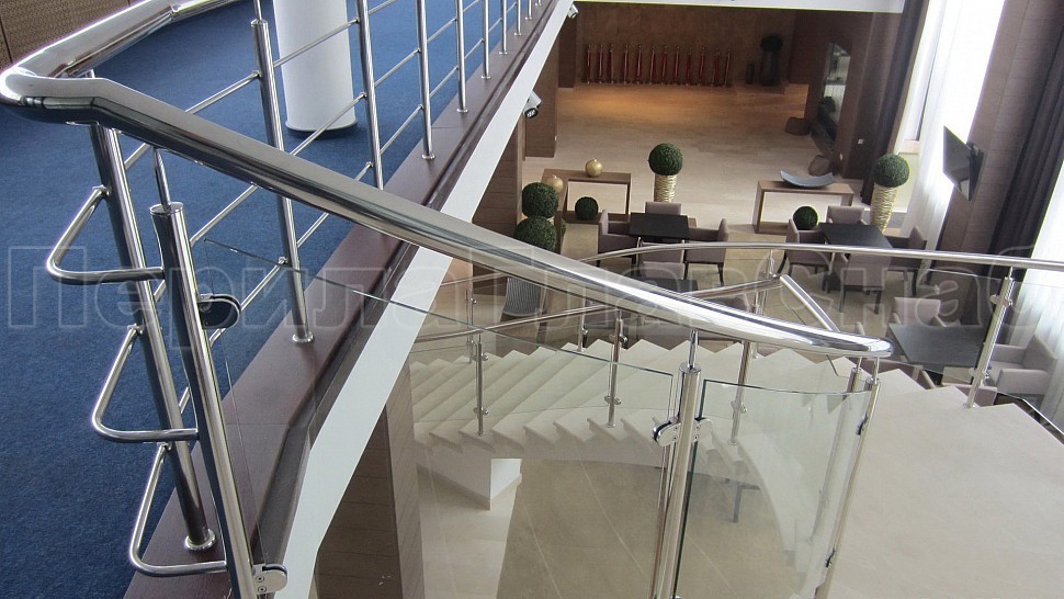 - Далее поручни цельностеклянных ограждений без разрыва переходят в ограждение из нержавеющей стали с тремя ригелями в атриуме.