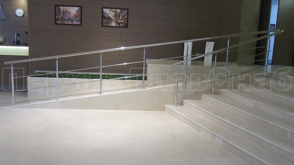 - Ограждение пандуса исполненно из нержавейки с двумя ригелями. Поручни из круглой трубы на нем завязаны в повороте для непрерывности скольжения руки.
