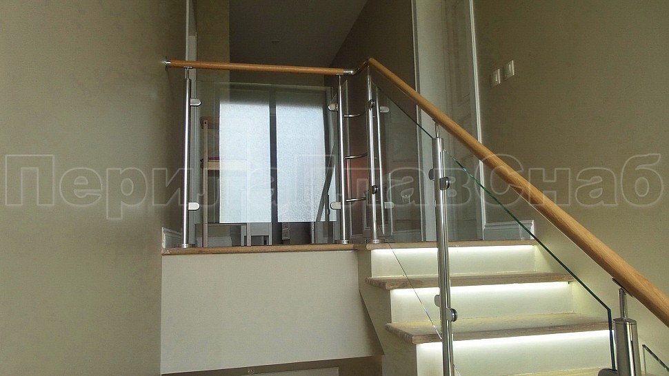 Стильное ограждение из нержавеющей стали с деревянным поручнем - оптимальное решение для частного дома. Деревянный поручень, в отличие от металлического, теплый на ощупь - за него удобно и приятно держаться. Сочетание натурального дерева и нержавеющей стали выглядит очень стильно и такое ограждение великолепно впишется в любой интерьер. В нашу компанию поступил такой заказ. Ограждения из полированной нержавеющей стали внутренние со стеклом высота 950 мм, стойки диаметром 38 мм, крепление сверху методом алмазного бурения диаметр 42 мм на глубину 70 мм, устанавливаются через две ступени в третью, на прямых участках не более 1000 мм друг от друга, наконечник стойки штырь; стекло закаленное прозрачное 8 мм, крепится на зажимные стеклодержатели; низ стойки декоративная крышка диаметр 56 мм, поручень деревянный диаметр 38 мм из дуба тонированный и лакированный, окончание поручня заглушка, уходов поручня в стену через фланец, поручень завязан нержавеющим отводом. Крепление нержавеющих элементов ограждения между собой точечная аргонно-дуговая сварка, с последующей зачисткой и полировкой.