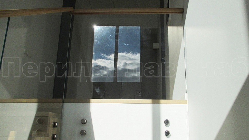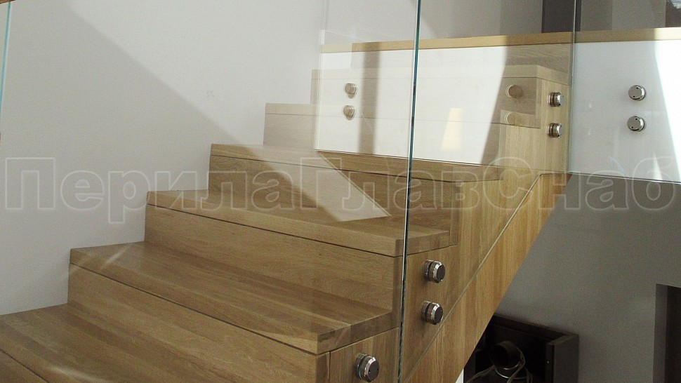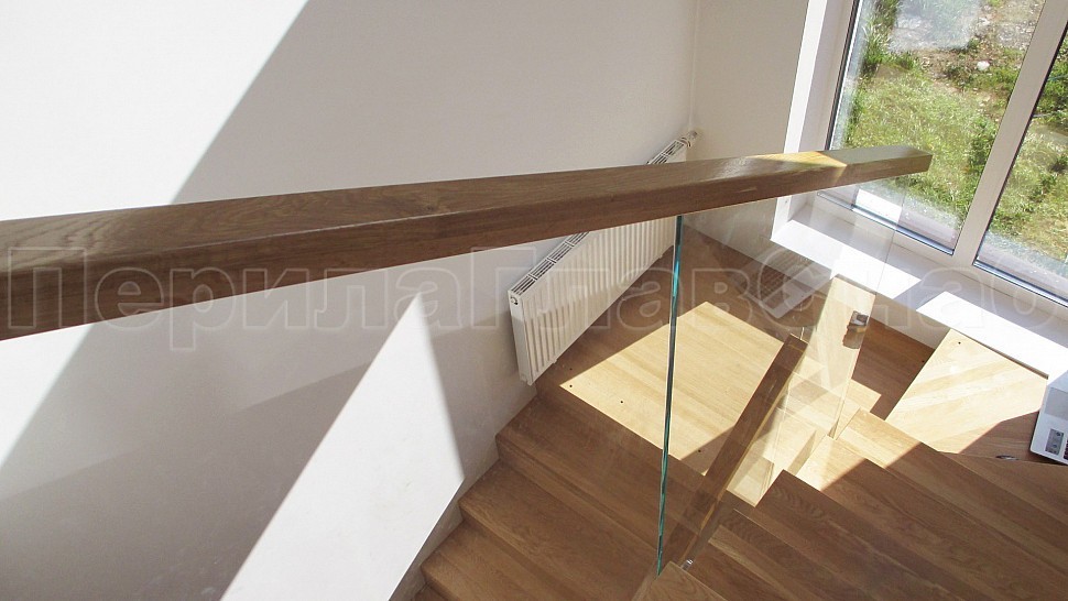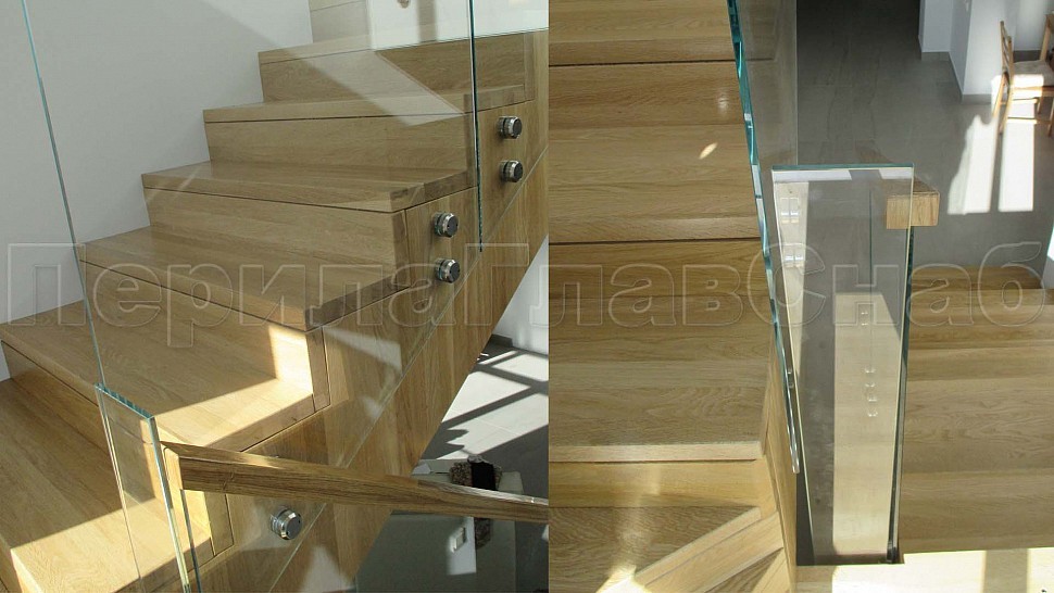 Объект- двухмаршевая лестница и площадка. Всего было установлено 7 погонных метров ограждений. Каленое стекло оптивайт закреплено на боковых стеклодержателях к лестнице, толщина стекла- 10мм. Сверху на стекло установлен лакированный поручень из массива дуба. Между маршами также была установлена стеклянная перегородка, призванная обезопасить жильцов дома помладше.