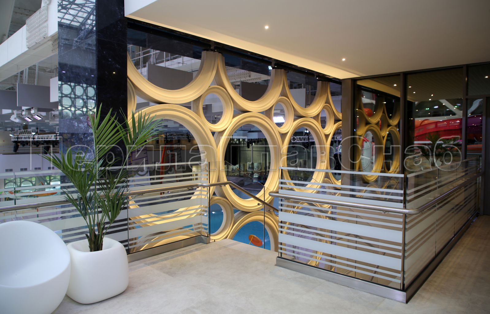 Так же была применена уникальная технология, позволяющая прокатывать и гнуть листы из нержавеющей стали высотой более 3000мм. Благодаря этим двум факторам конструкция колонн приобрела аккуратный, цельный монолитный вид. Работы по изготовлению и монтажу ограждений под ключ, были выполнены в течении тридцати рабочих дней