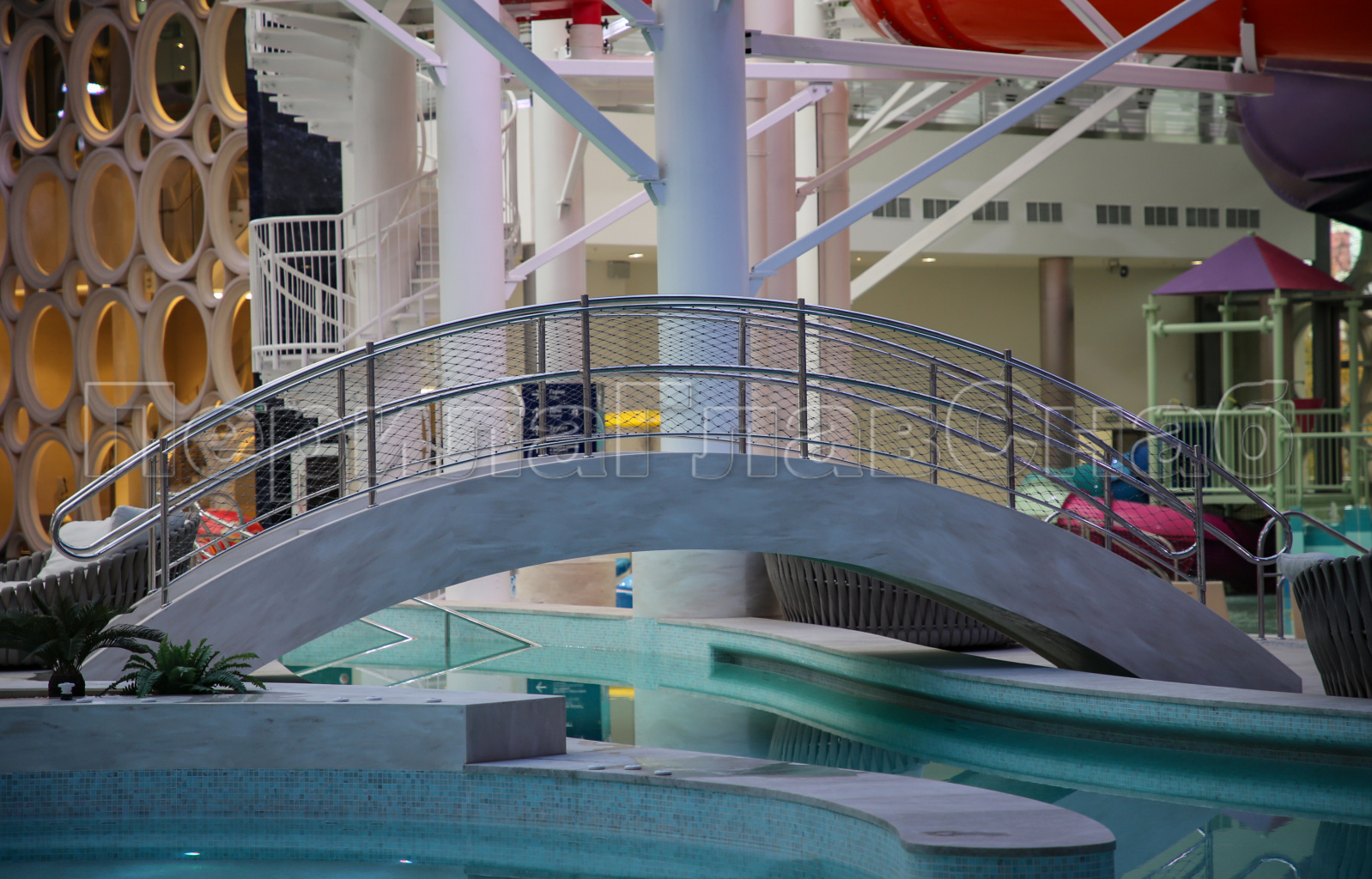 Так же на данном объекте нами были установлены ограждения из полированной нержавеющей стали конструктив которых состоял из стойки диаметром 38мм, двойного поручня такого же диаметра, завязанного между собой с заполнением между стоек сеткой. Сетка была смонтирована точечной сваркой. Каждый пучок тросов приваривался после натяжения к металлической конструкции, что потребовало кропотливой и трудоемкой работы монтажников. Все сварные швы ограждения так же были зачищены и заполированы.