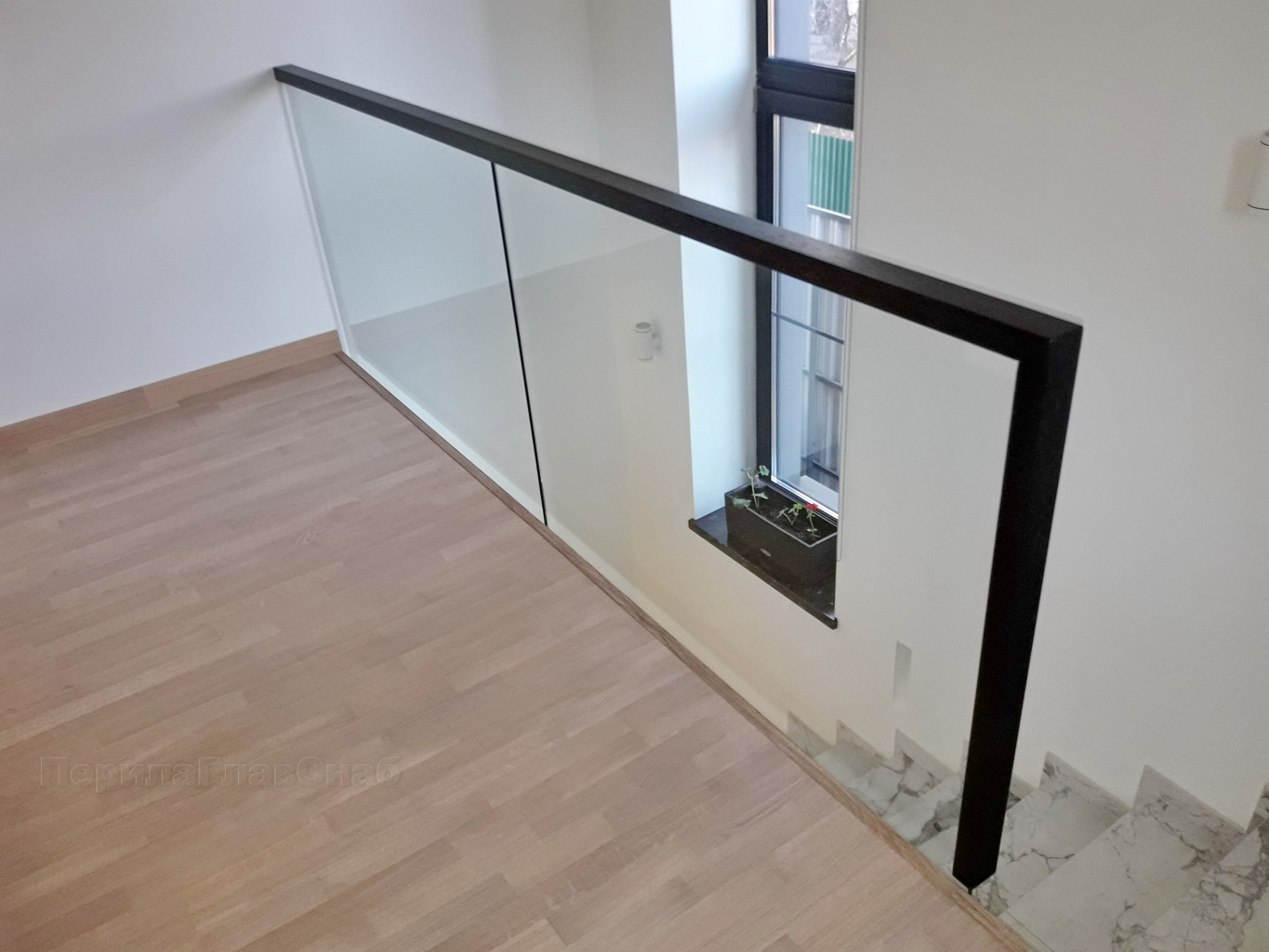 - Устанавливая ограждения с деревянными вставками лучше всего использовать заполнение из каленого стекла на стеклодержателях для повышения безопасности.