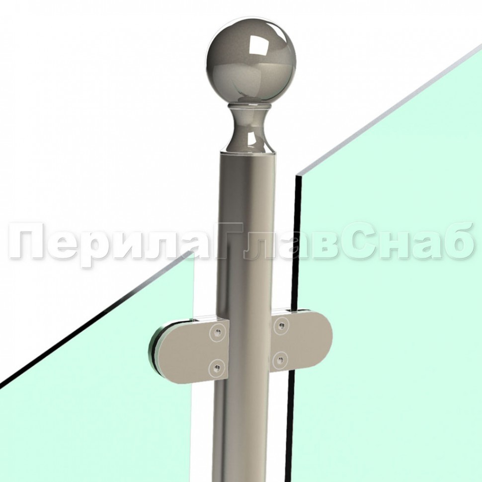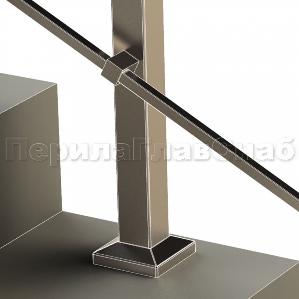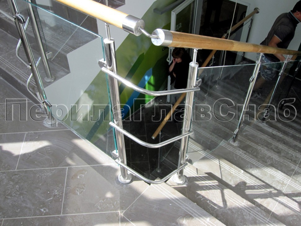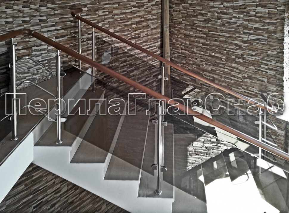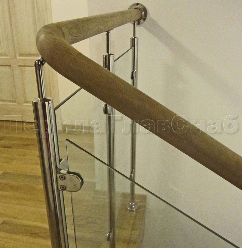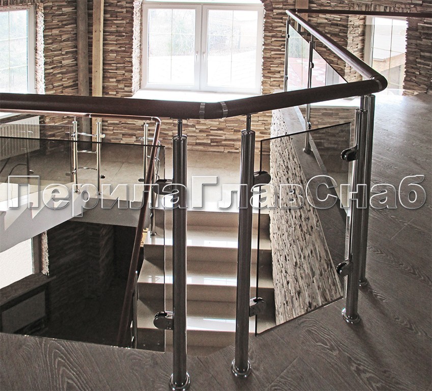 - Ограждение с деревянным поручнем, стеклом и стойками
