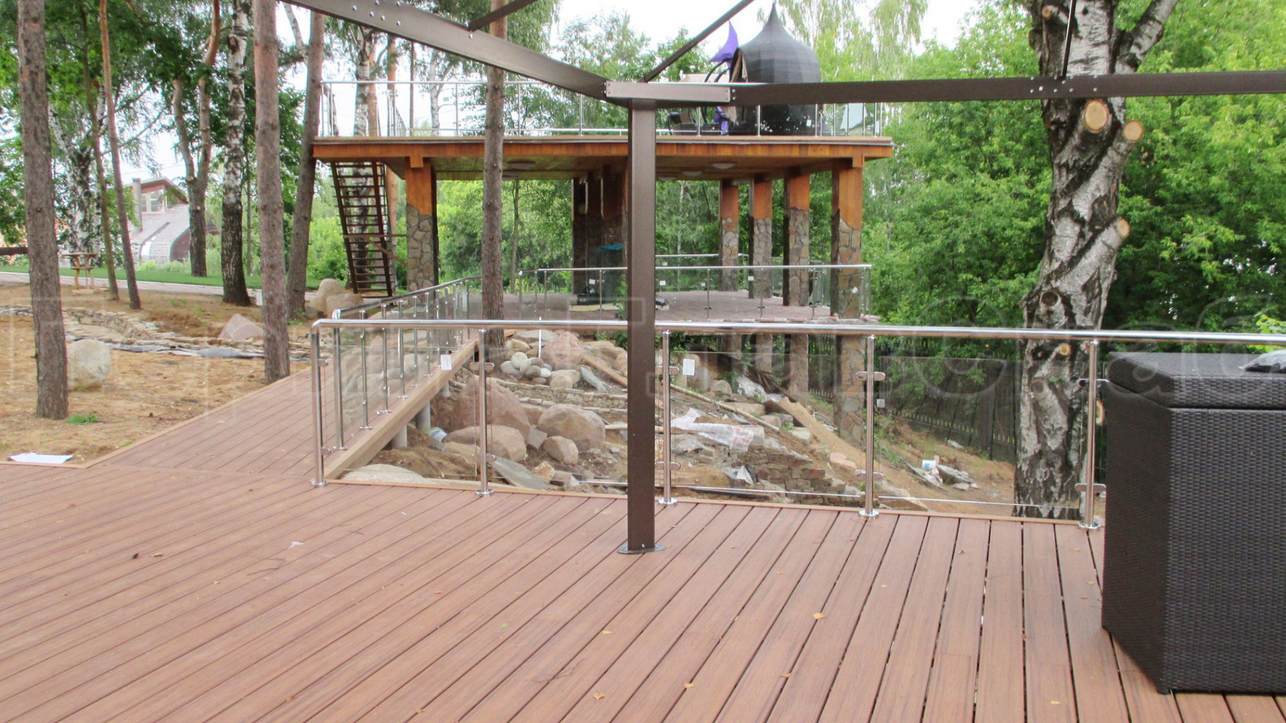 Ограждения из нержавейки со стеклом без поручней также очень популярны. Чаще всего их предпочитают для оборудования открытых площадок кафе, балконов, террас загородных домов.
