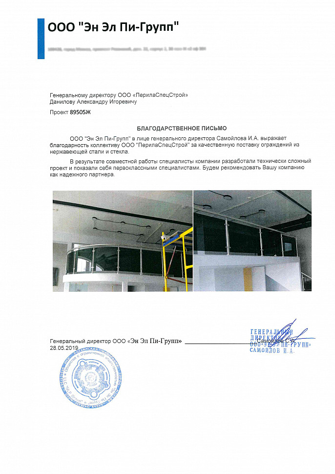 ООО "Эн Эл Пи-Групп" в лице генерального директора Самойлова И.А. выражает благодарность коллективу ООО "ПерилаСпецСтрой" за качественную поставку ограждений из нержавеющей стали и стекла.