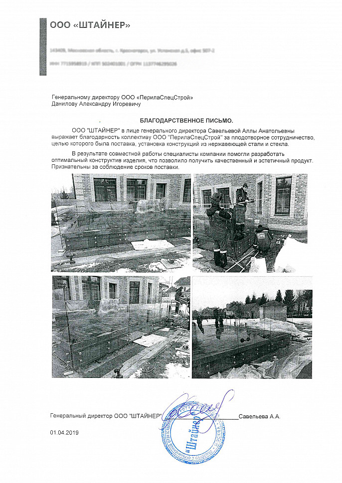 ООО "Штайнер" в лице генерального директора Савельевой Аллы Анатольевны выражает благодарность коллективу ООО "ПерилаСпецСтрой" за плодотворное сотрудничество, целью которого была поставка, установка конструкций из нержавеющей стали и стекла.
