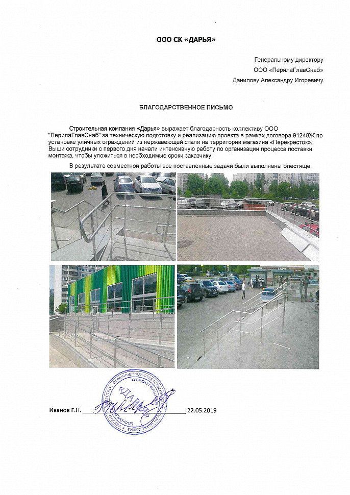 Строительная компания "Дарья" выражает благодарность коллективу ООО "ПерилаГлавСнаб" за техническую подготовку и реализацию проекта в рамках договора 91248Ж по установке уличных ограждений из нержавеющей стали на территории магазина "Перекресток".