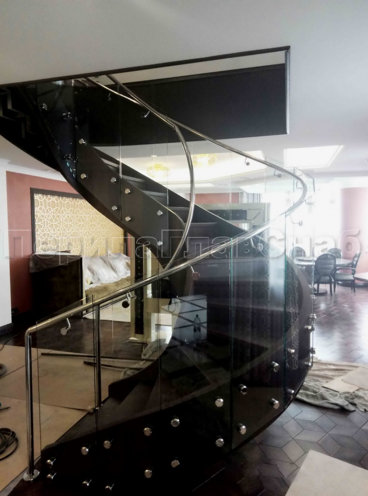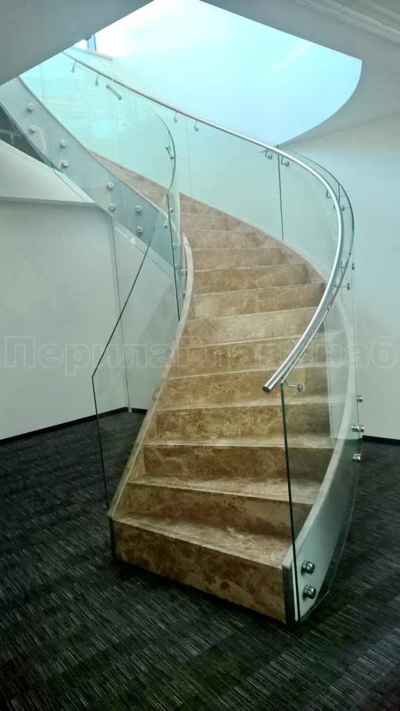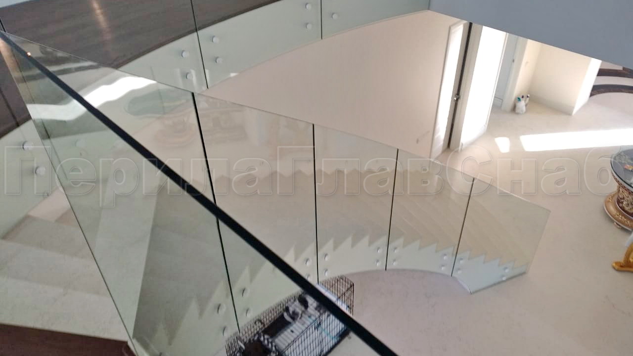 Цельностеклянные ограждения для забежных лестниц с обработкой стекла - фаска.