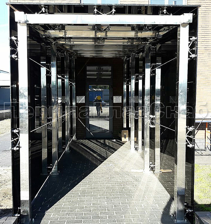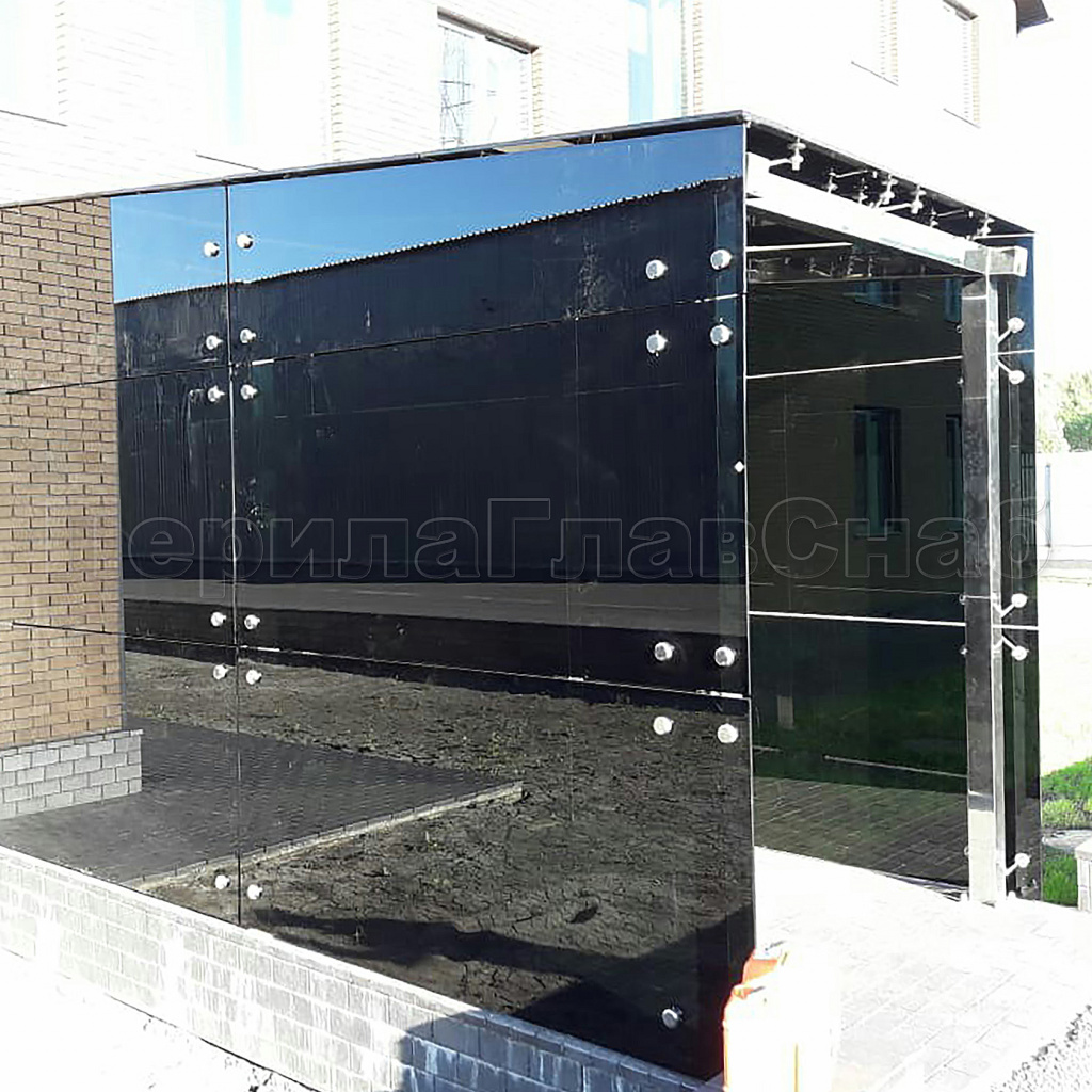 - долговечность и практичность. Козырек из стекла на спайдерах имеет продолжительный срок эксплуатации, не требует специализированного ухода;
